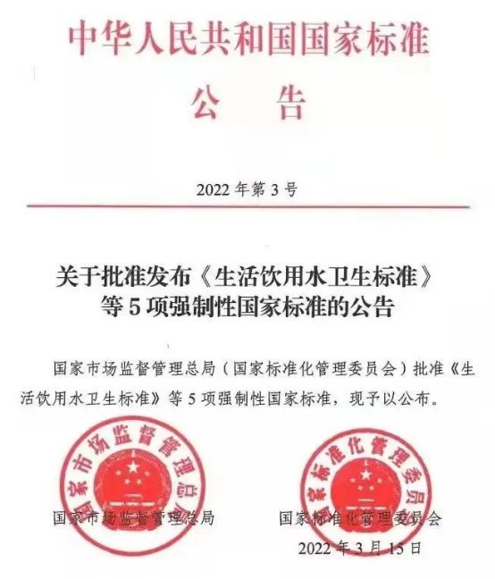 2022年3月15日,国家市场监督管理总局和国家标准化管理委员会联合发布中华人民共和国国家标准公告(2022年第3号)“关于批准发布《生活饮用水卫生标准等5项强制性国家标准的公告》”,正式批准《生活饮用水卫生标准》等5项强制性国家标准。
