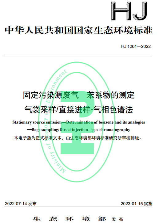 固定污染源废气 苯系物的测定 气袋采样/直接进样-气相色谱法 HJ 1261—2022